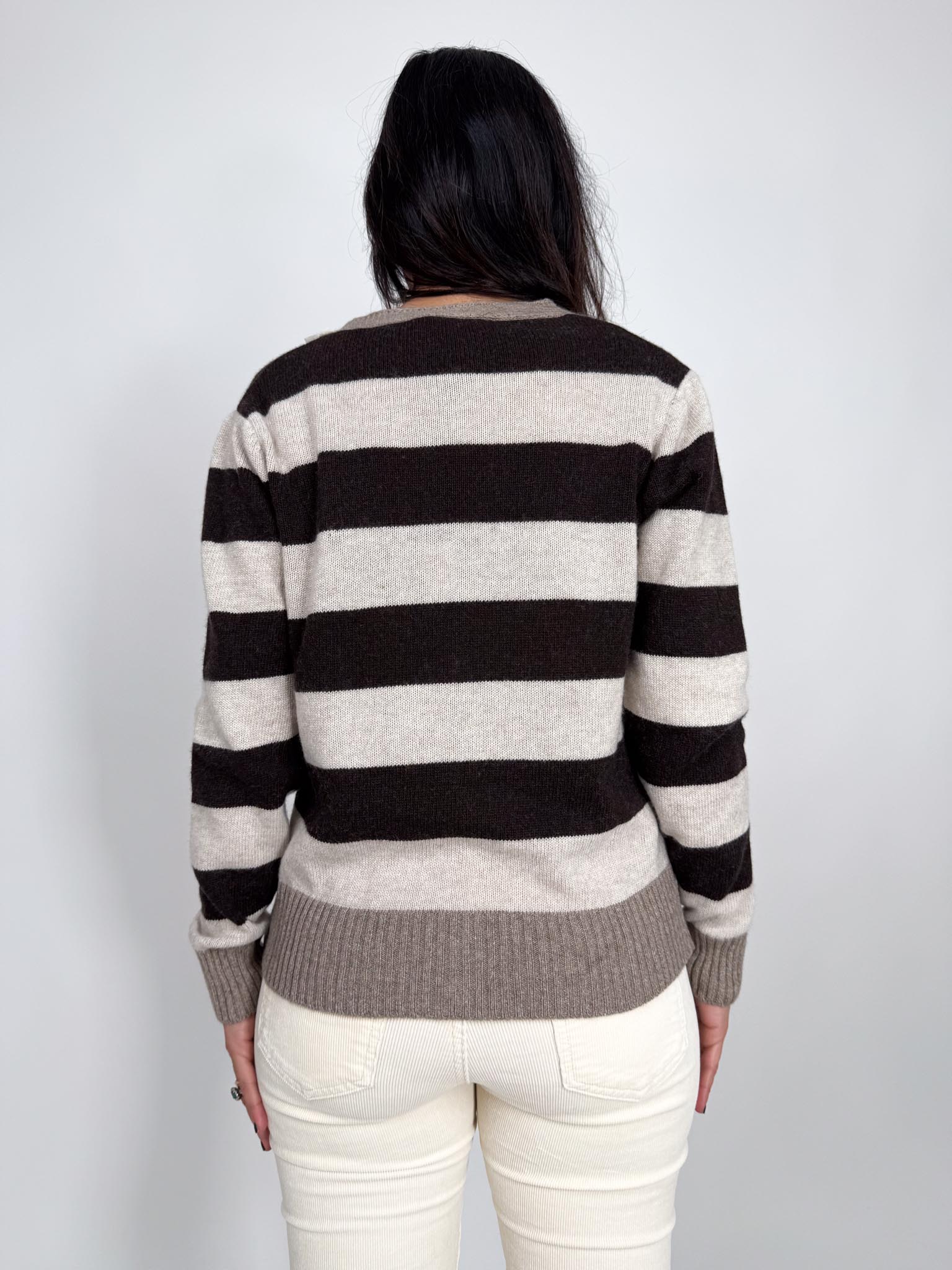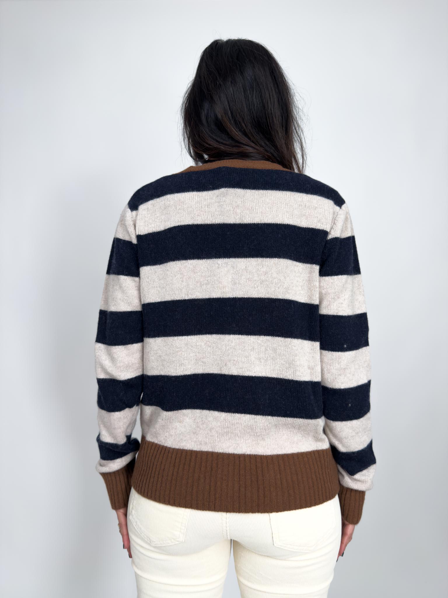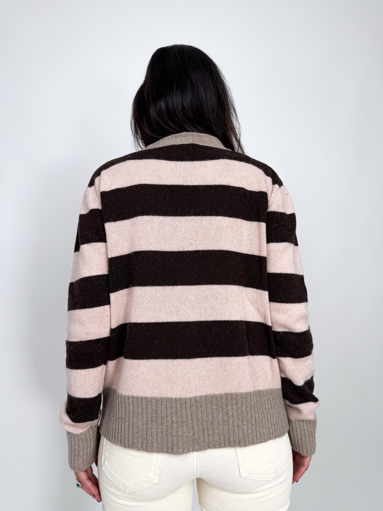 Cardigan scollo a V con bottoni in lana, cashmere e viscosa con righe orizzontali a contrasto di colore.