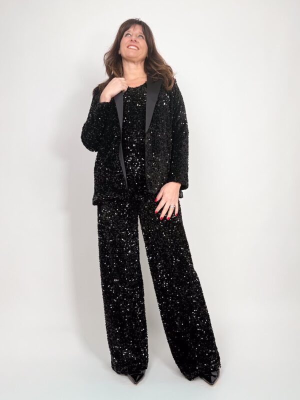 Giacca paillettes con bavero in raso, vestibilità comoda, fodera interna e spalline.
