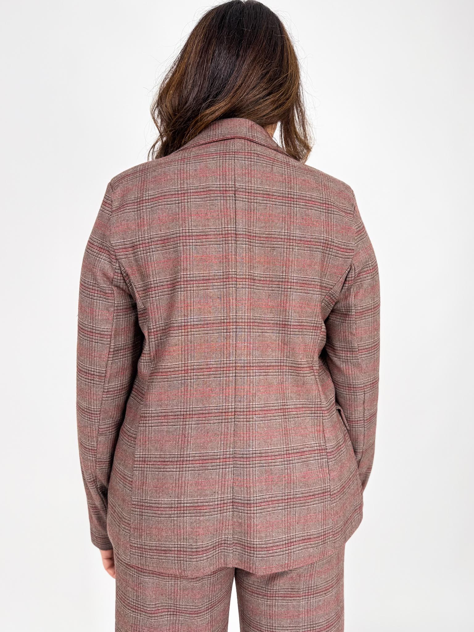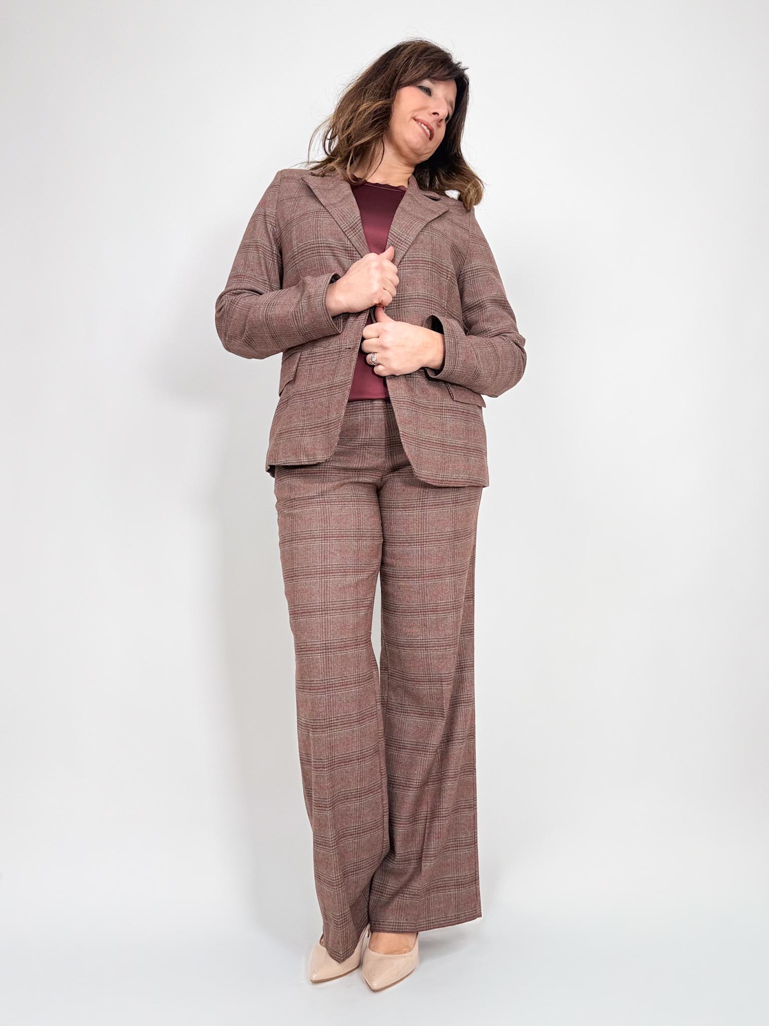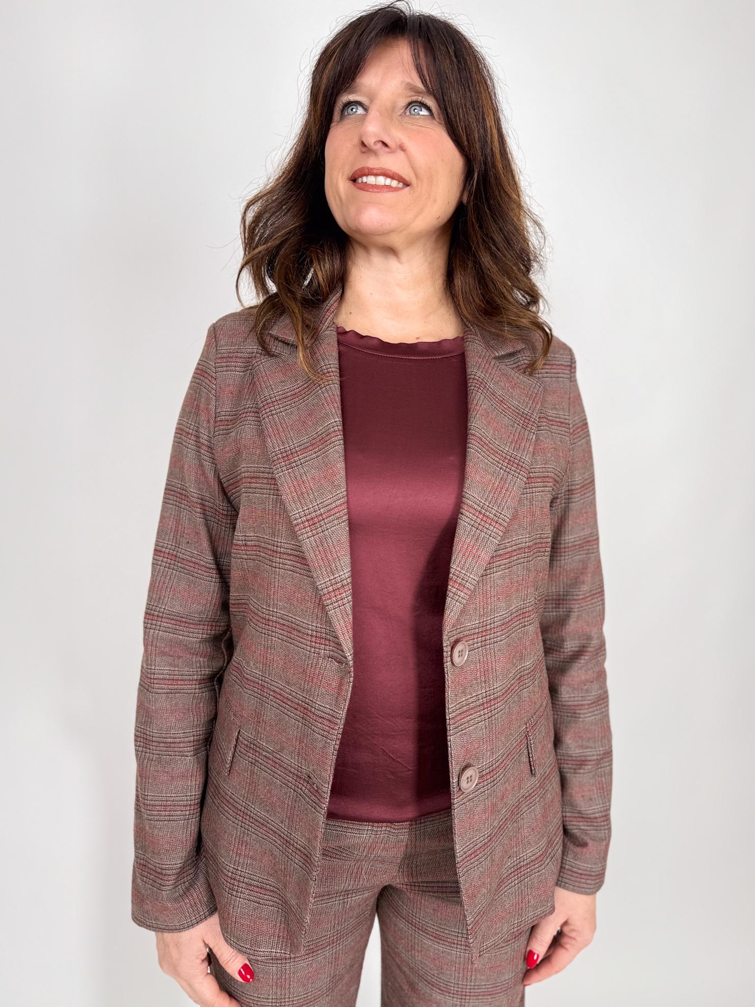 Giacca in poliviscosa invernale, check cammello bordeaux, vestibilità regolare, rever a lancia, 2 bottoni.
