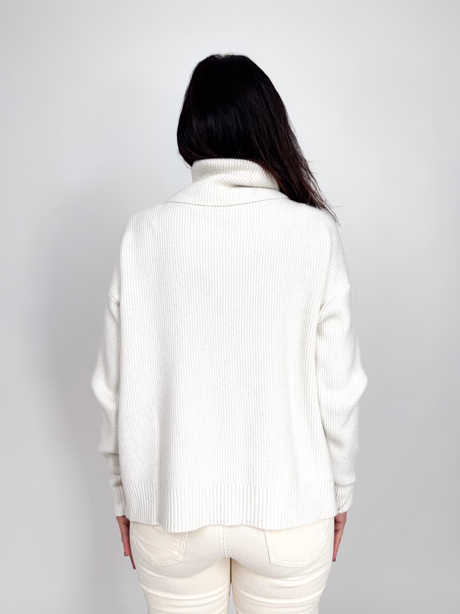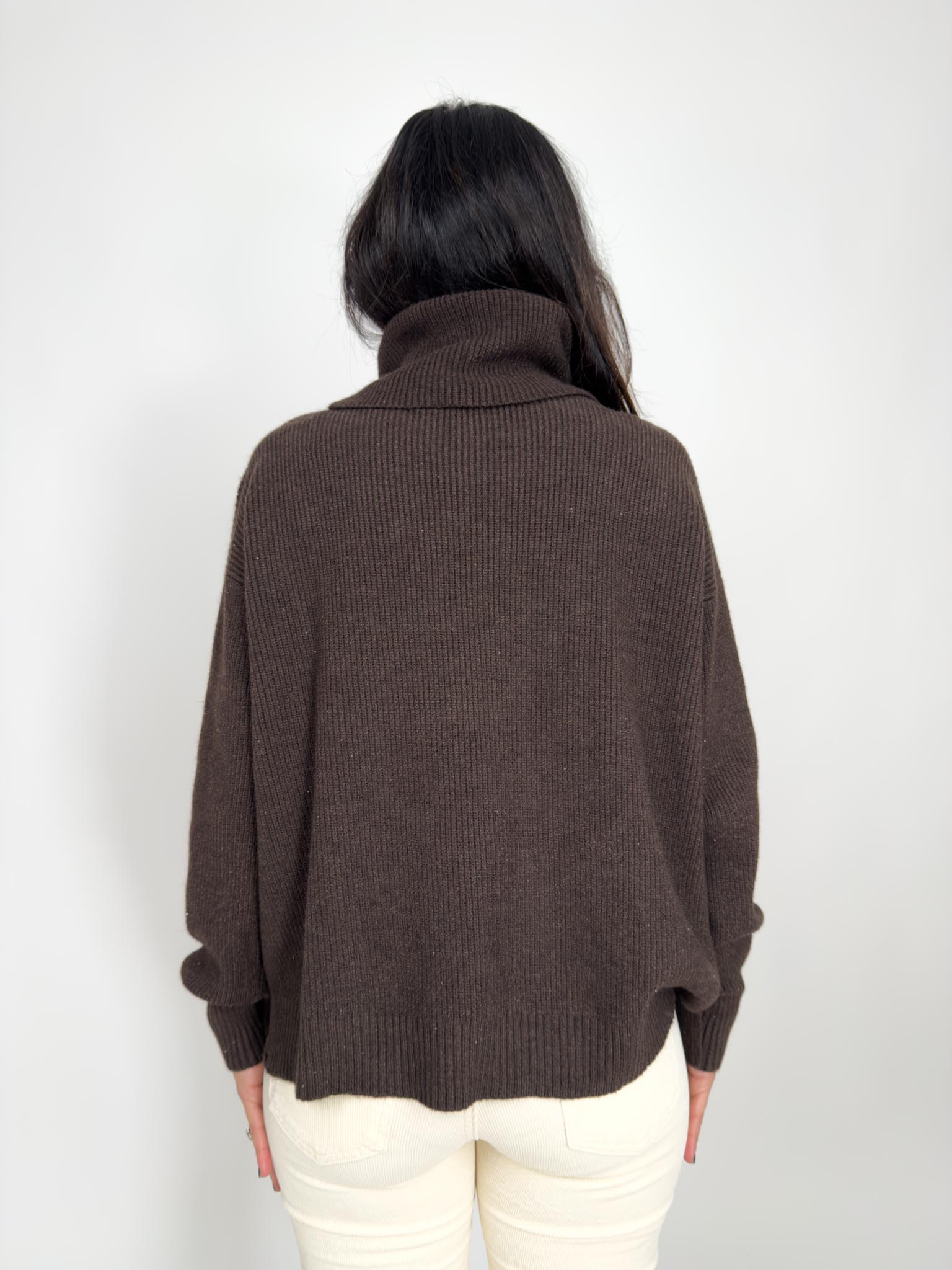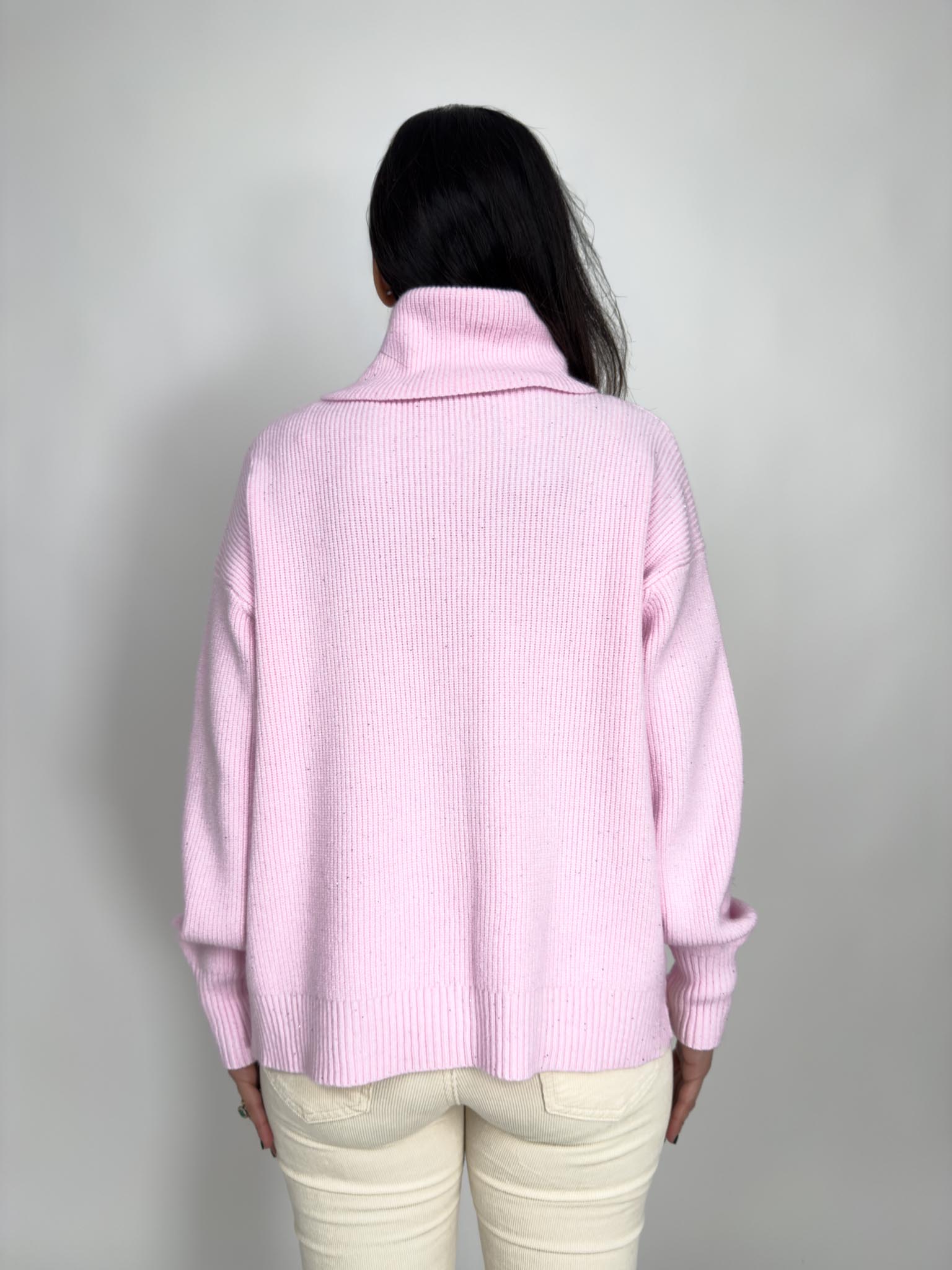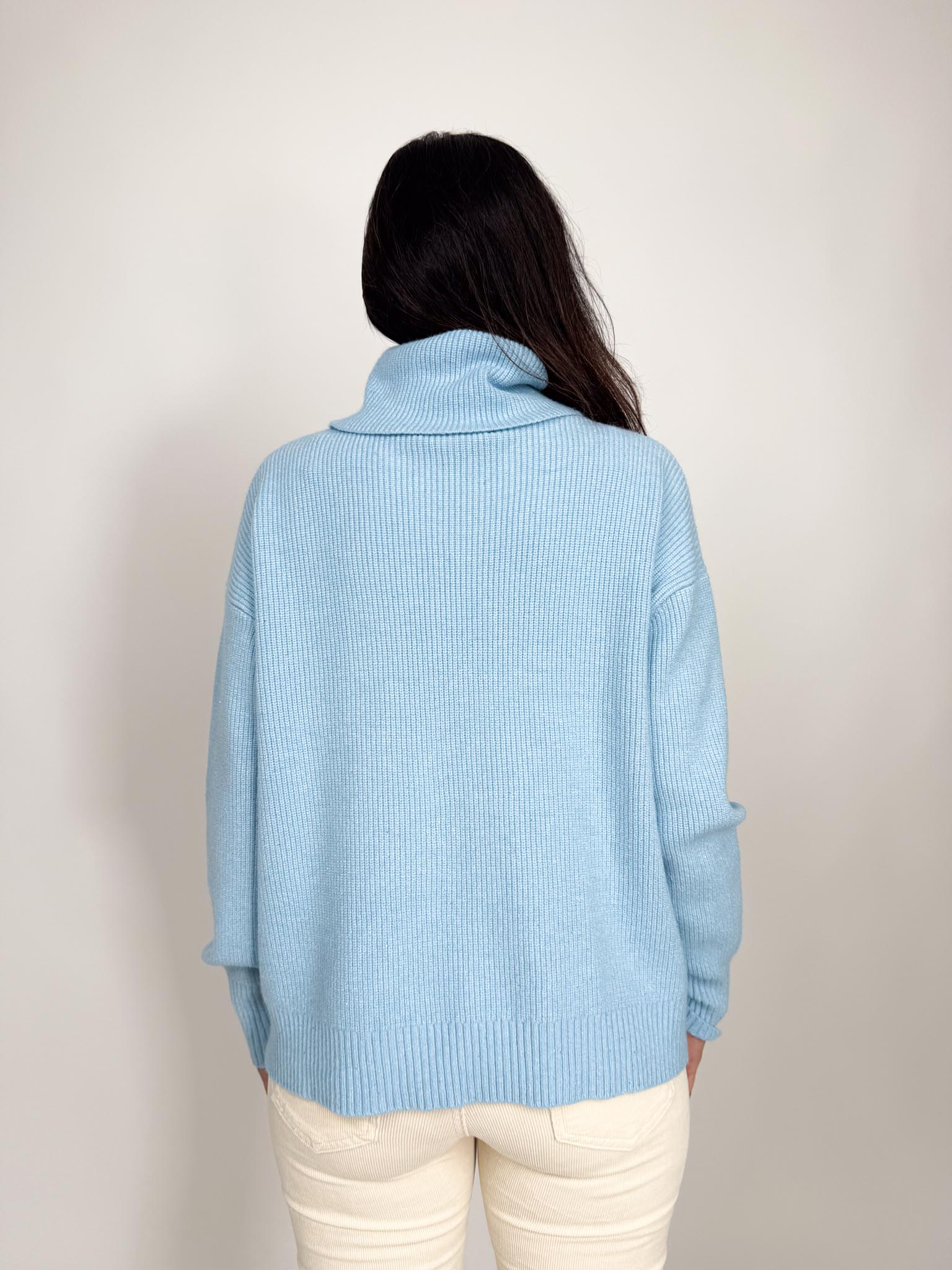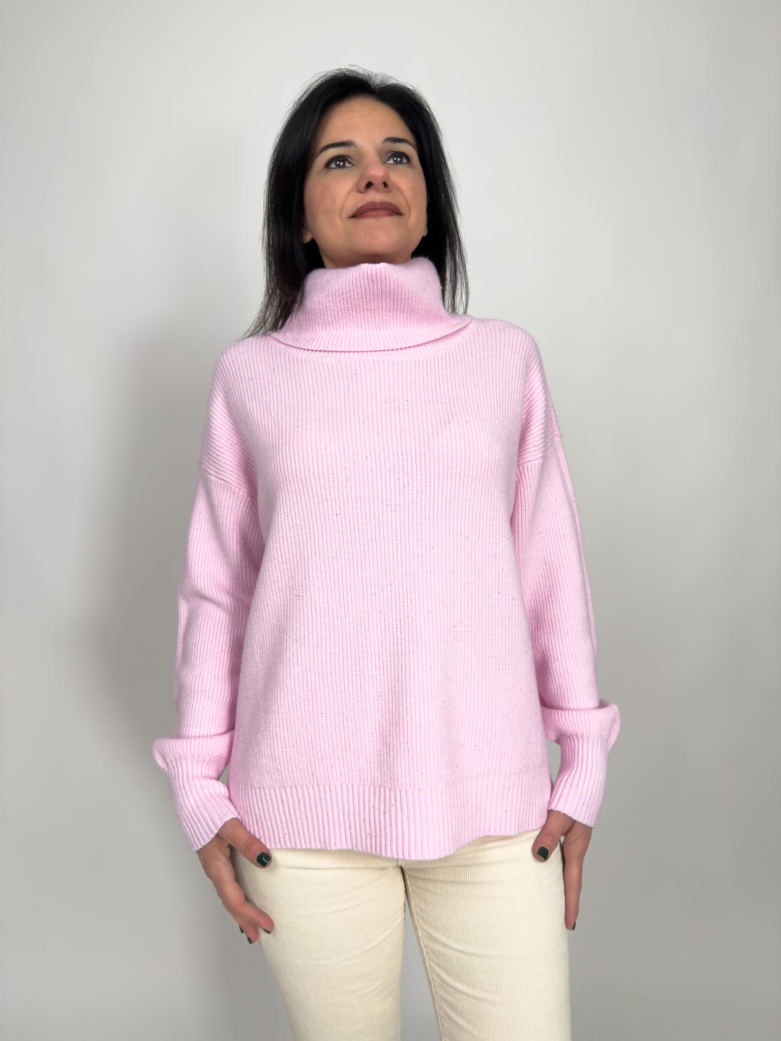 Maglia in viscosa lavorazione costine con punti luce, collo alto.