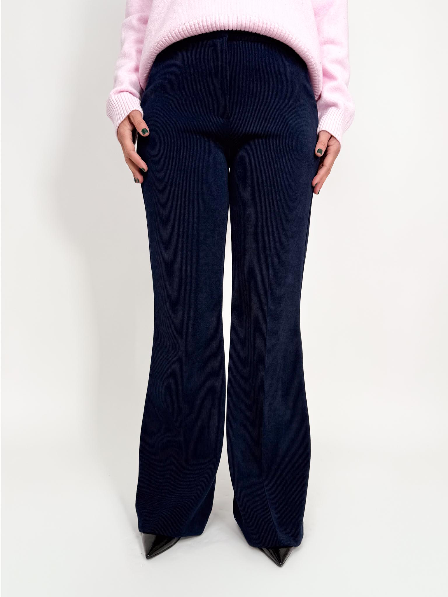 Pantalone a zampa con bottone e zip in velluto a coste.